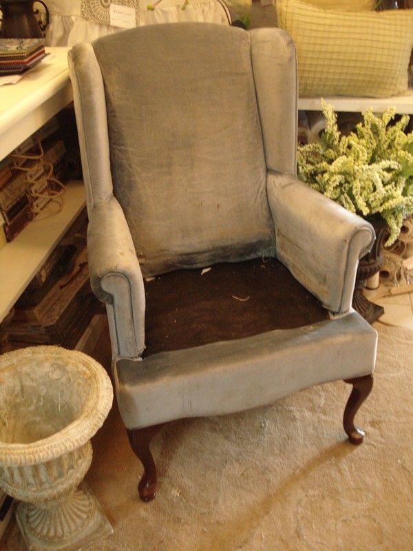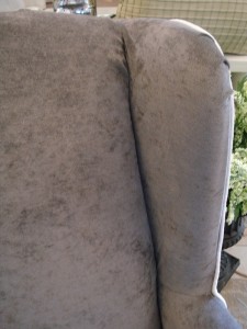 First, we want to show you the “before” shot of a chair prior to slipcover. Not too pretty, is it? We found this chair second-hand and knew it had potential. We designed a new slipcover for it in Eddystone velvet Monte Carlo Silver fabric.
