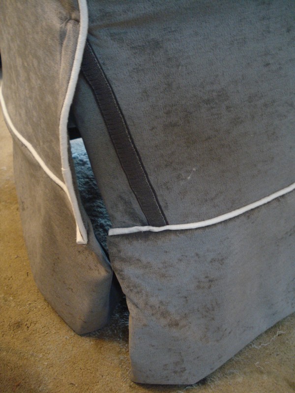 This is where we put the Velcro stick on the slipcover. This controls the tightness of the slipcover. It also makes it easy to put on and take it off. For a tailored fit, you close it up, or for shabby chic, just let it hang loose.